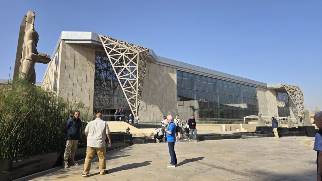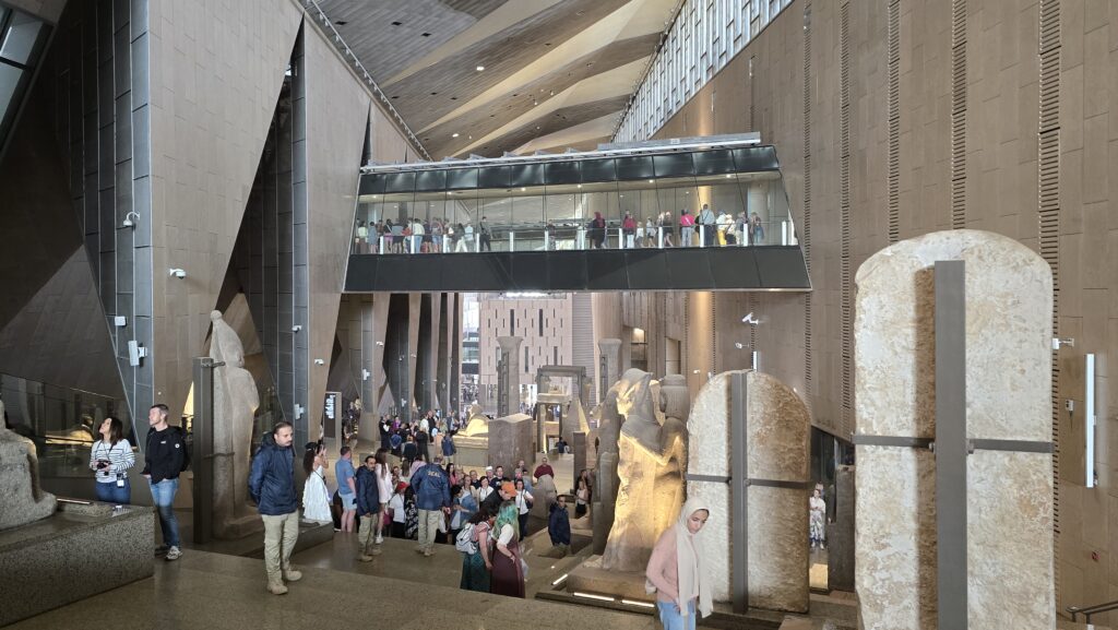 Bereits von außen beeindruckt das Museum durch seine monumentale, moderne Architektur aus hellem Stein und Glas. Es liegt direkt in Gizeh mit spektakulärem Blick auf die Pyramiden.